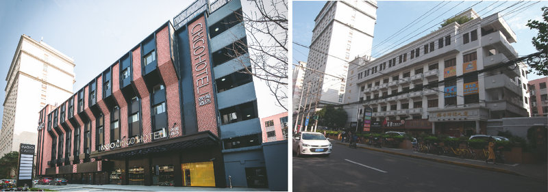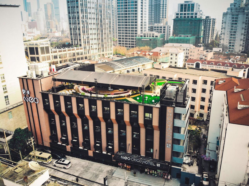 标识设计延续建筑理念,字母”E”形似电源按钮图案,呼应NEO”焕新传统”的核心思想。原有建筑存在多处凹凸结构,通过斜向墙面处理整合出简洁体量,强化纵向立面的构成逻辑与材质表现。为提升酒店公共功能,屋顶设有绿化花园、吧台空间与活动广场。于此可俯瞰融合老上海风情与近十年新兴高层建筑的特有景致,感受新旧交融的上海城市魅力。
