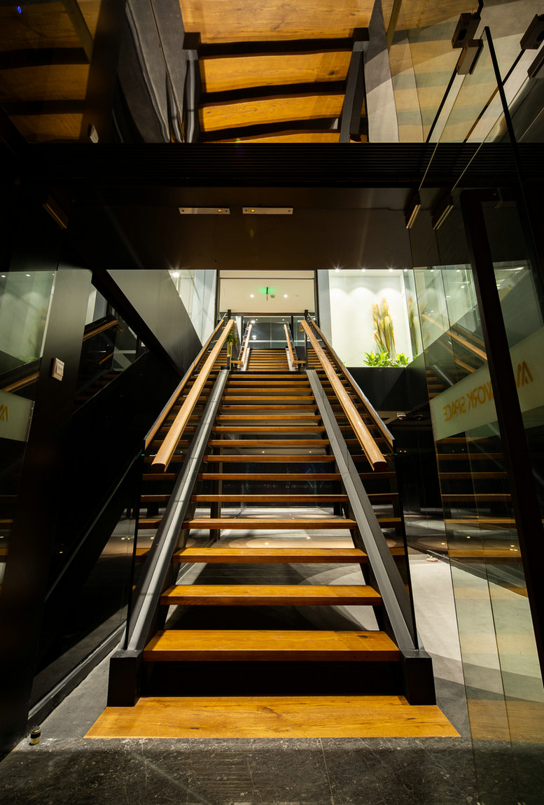 项目命名为”NEO”,寓意”焕旧新生”。建筑外立面采用砖砌瓷砖与黑色金属板构筑视觉印象,既与武夷路环境相融合,又为周边街景注入温暖质感。内部空间大量运用金属与镜面元素打造未来感装潢,通过与外立面的强烈反差为访客带来惊喜与新鲜体验。针对原有建筑一层层高较低的问题,特别采用镜面天花板设计以延伸空间感。这种古典与新兴元素的交融,正是NEO设施形象的具象呈现。