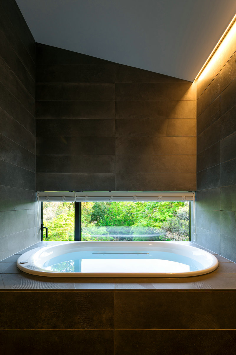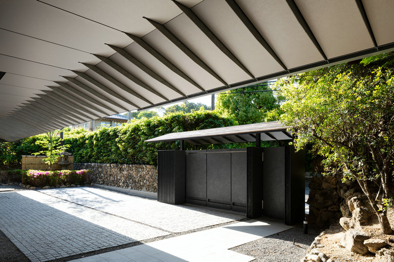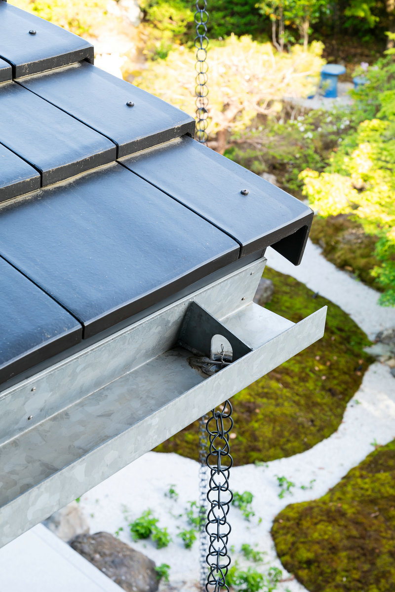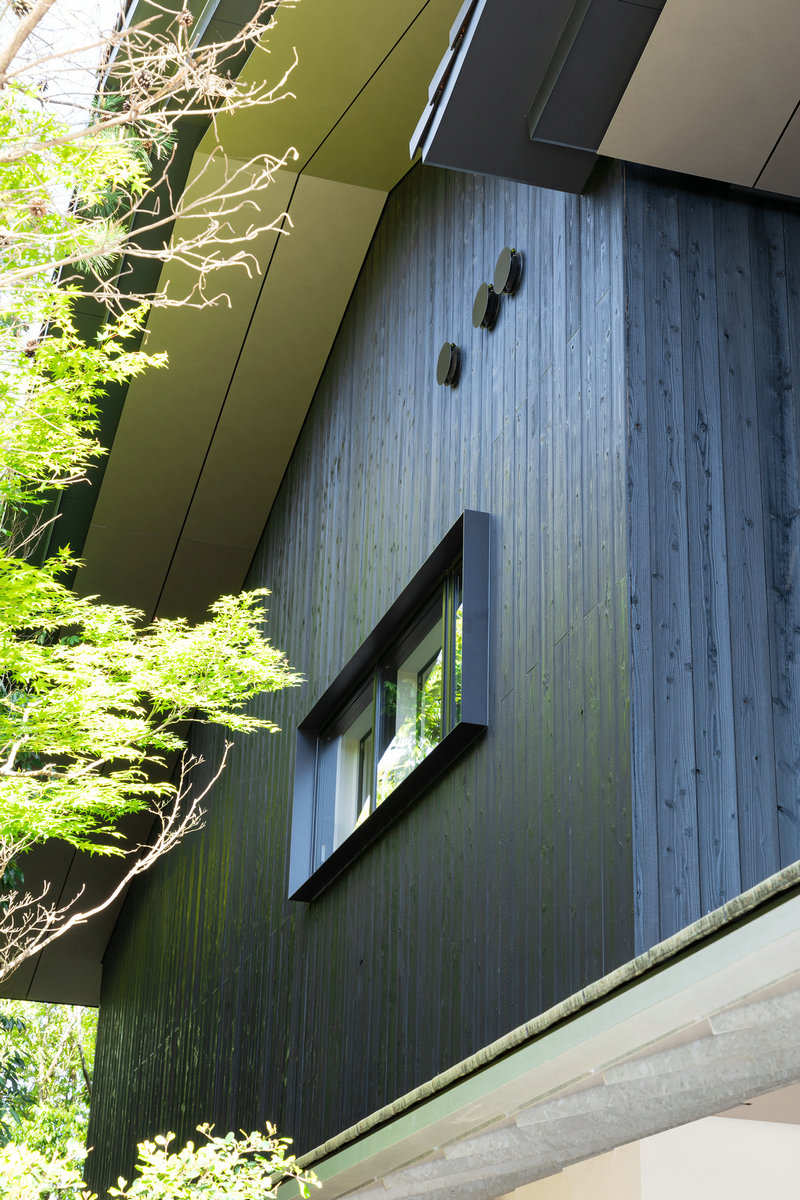 大屋根の軒の出は最大で約2.5mあり、大きな面積の軒天が出現する。風致地区での指定がなかった無方向性ヘアライン仕上げのアルミカットパネルを軒天の素材に用いることで、外の緑を薄っすら映し出し、室内の明かりをテラスに注ぐような柔らかな環境を作り出している。また、目線に近い下屋の軒天はカットTによる現しの垂木とすることで、金属質で現代的な和風表現をしている。