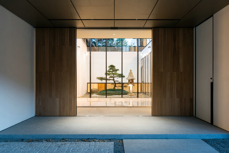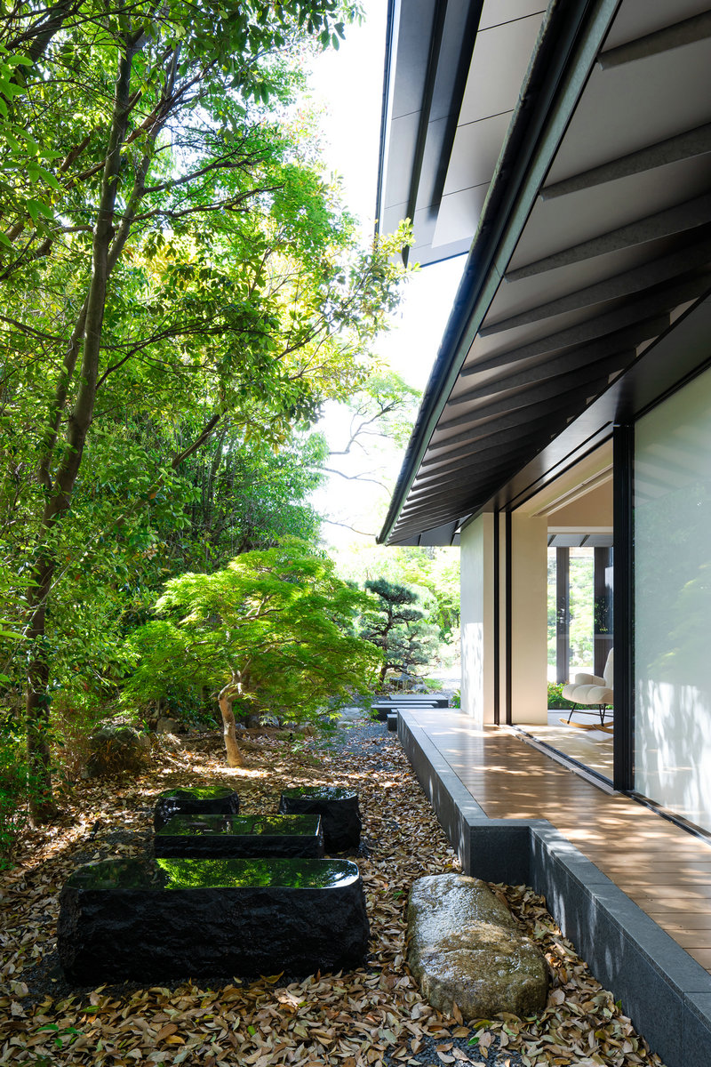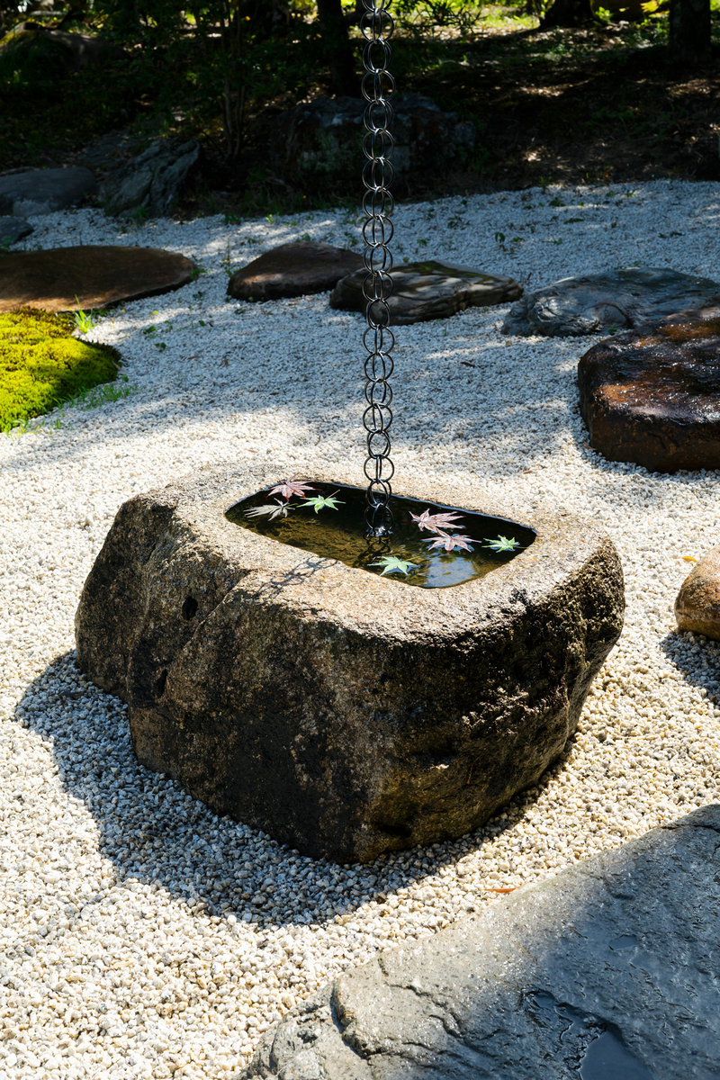 従前に利用されていた、もしくは散在していた手水鉢・蹲・石灯籠・石は、それぞれの庭に再配置することで、古と今を繋ぎとめる役割を担っている。具体的には、「松の中庭」には新規の黒松と既存の石灯籠を組み合わせ、既存の巨大な手水鉢は鎖樋と接続するなどの操作を行うことで、新たな景観と機能を纏っている。