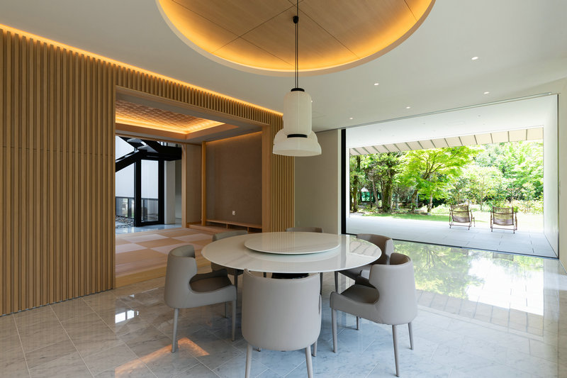 日本の和風住宅を鉄骨造で表現した新しさと古さが入り混じりながら環境に溶け込む住宅となっている。