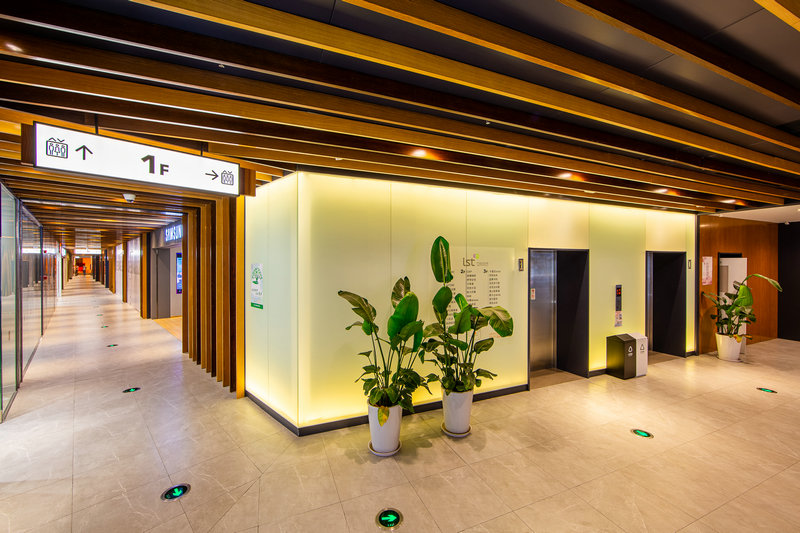 既存建物は長細い平面に加えて高層住宅が多数のっているため、建物内部に開放的な空間を作ることが構造的に不可能であった。またクライアントの有効率の要求が65パーセントを超えていたため内部の共用面積を削る必要があった。飲食機能が設定されている2階をキーフロアと考えて、二階に街路樹を臨める空中路地(主動線)を挿入した。動線を開放的になり、飲食店は路面店のように街路樹の景色を享受でき、テーブル椅子を動線にはみ出すことを想定した。また、交差点付近に外部ESを設置して歩行道から自然に人を2階にあげる仕掛けを作った。それにより街と建物をより近づけることができる。
