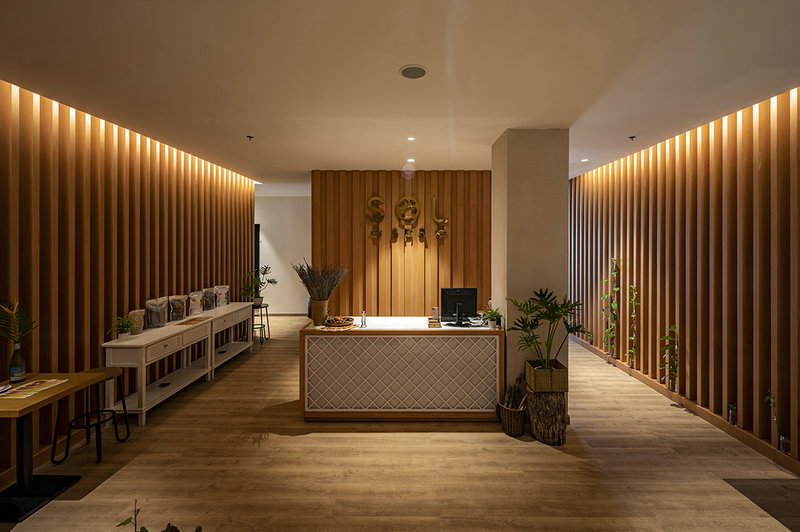 ホテル公園内に点在する各機能の驿站は森の中で自然環境と共存するようにアジア共通の成語でもある「風花雪月」というテーマで考えた。そのため、敷地内外にある特徴的な自然や木々はそのまま保存し、その中でそれぞれの屋根が森の中に浮遊する蝶や鳥のような印象を持たせるようにしている。具体的には壁面や地面はできる限り周囲の環境と溶け込むように周囲の自然素材やガラスを使っている。